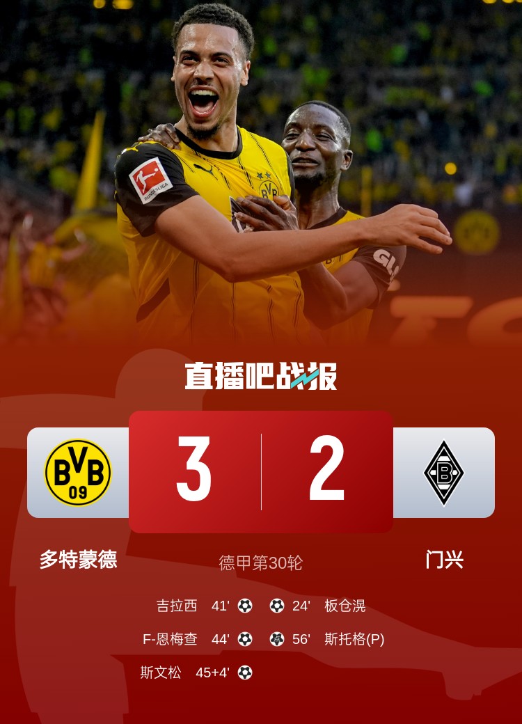 多特3-2擊敗門興,吉拉西、恩梅查和斯文松各打入一球。