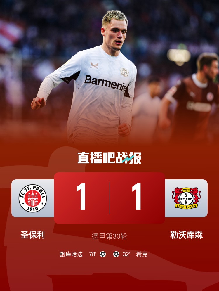 德甲-勒沃庫(kù)森1-1圣保利距榜首8分 ??祟^球破門格里馬爾多獻(xiàn)助攻