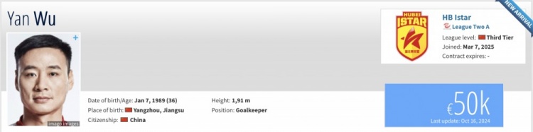 3月7日訊 根據(jù)德國(guó)轉(zhuǎn)會(huì)市場(chǎng)網(wǎng)站信息顯示,36歲的門將吳龑已經(jīng)復(fù)出加盟了中乙湖北青年星。
