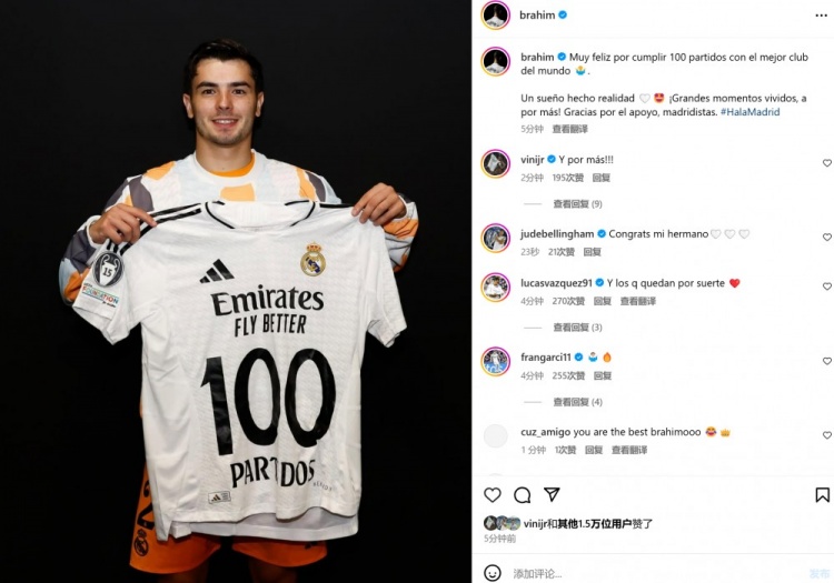 這也是迪亞斯為皇馬各項賽事出戰(zhàn)的第100場比賽,賽后他也在個人社媒曬出與100場紀念球衣的合影,配文寫道:“很高興能為世界最佳俱樂部完成100次出場,一個夢想實現(xiàn)了。美好的瞬間永存,讓我們去爭取更多!感謝皇馬球迷的支持!”