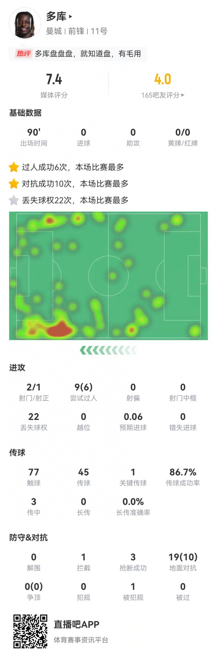 多庫本場9過人6成功 19對抗10成功 22丟失球權(quán)+3搶斷 獲評7.4分