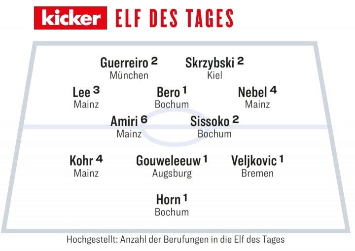 中場(chǎng):李在城(美因茨)、阿米里(美因茨)、馬圖斯-貝羅(波鴻)、易卜拉希馬-西索科(波鴻)、內(nèi)布爾(美因茨)