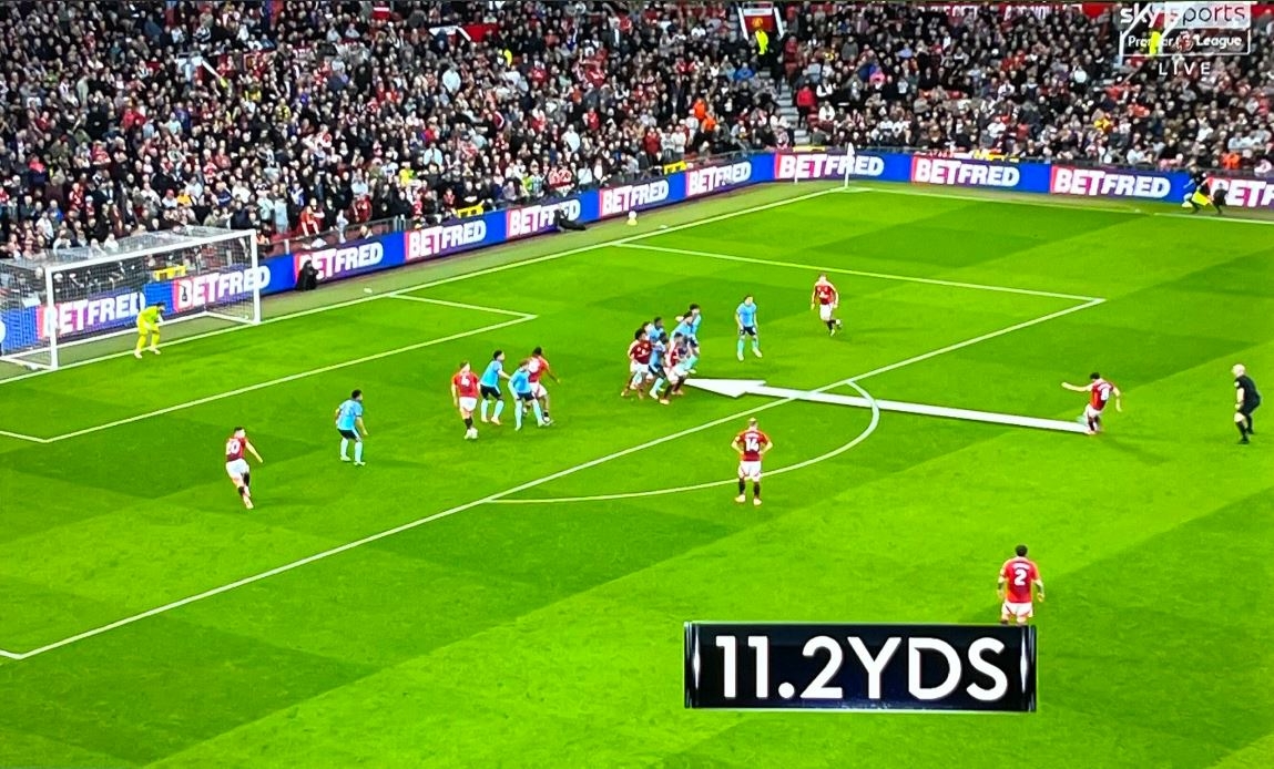 人墻失誤?轉(zhuǎn)播顯示B費(fèi)任意球距槍手人墻11.2碼,規(guī)則僅要求10碼