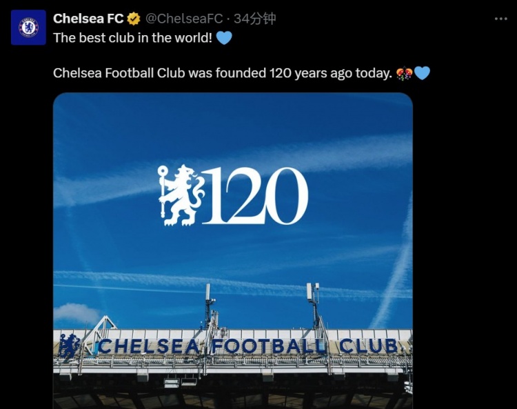 切爾西官推表示:“世界最佳俱樂(lè)部!切爾西在120年前的今日正式創(chuàng)立!”