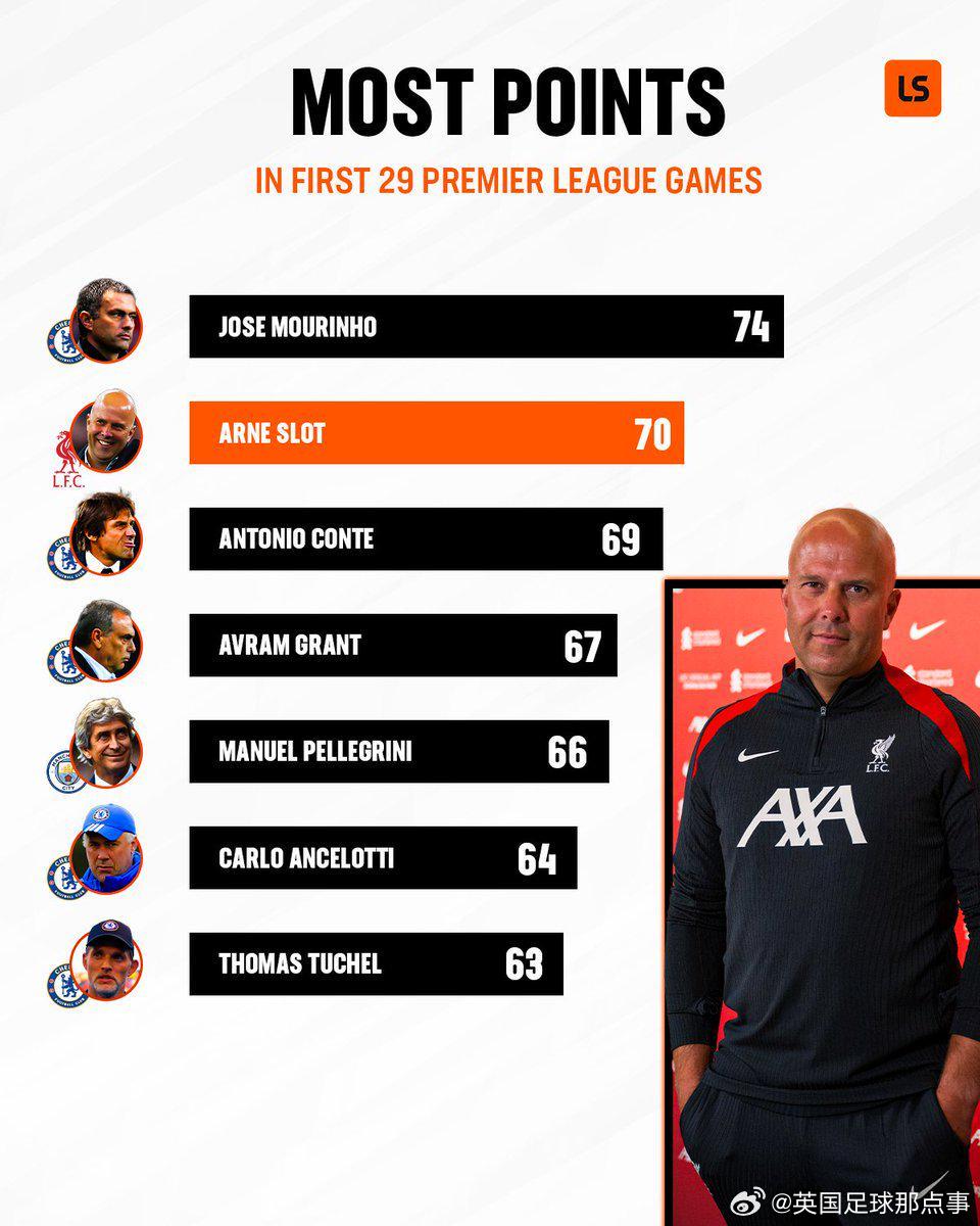 英超主帥前29場積分:穆帥74分第1,斯洛特70分第2,藍軍主帥霸榜