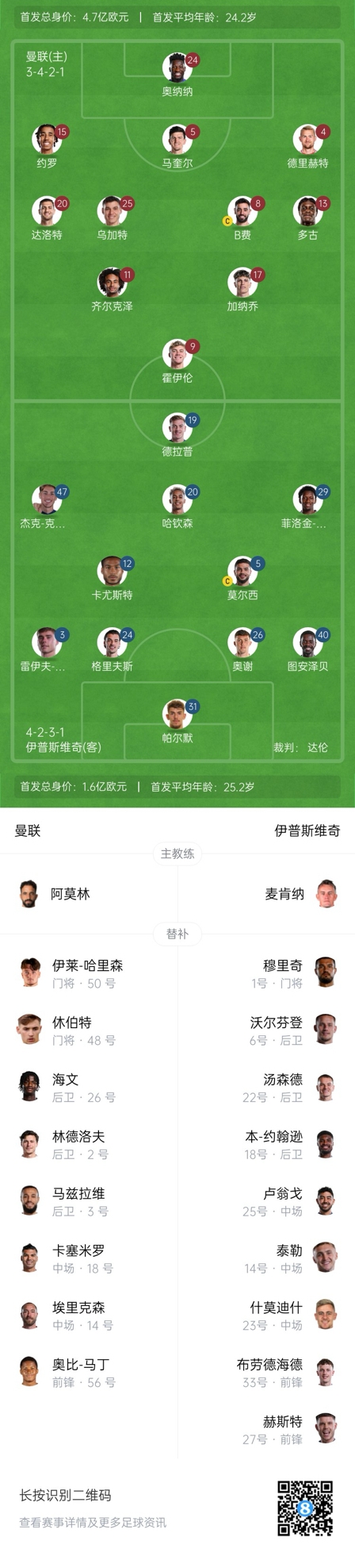 曼聯(lián)首發(fā):24-奧納納、4-德里赫特、5-馬奎爾、15-約羅、20-達洛特、25-烏加特、8-B費、13-多爾古、17-加納喬、11-齊爾克澤、9-霍伊倫