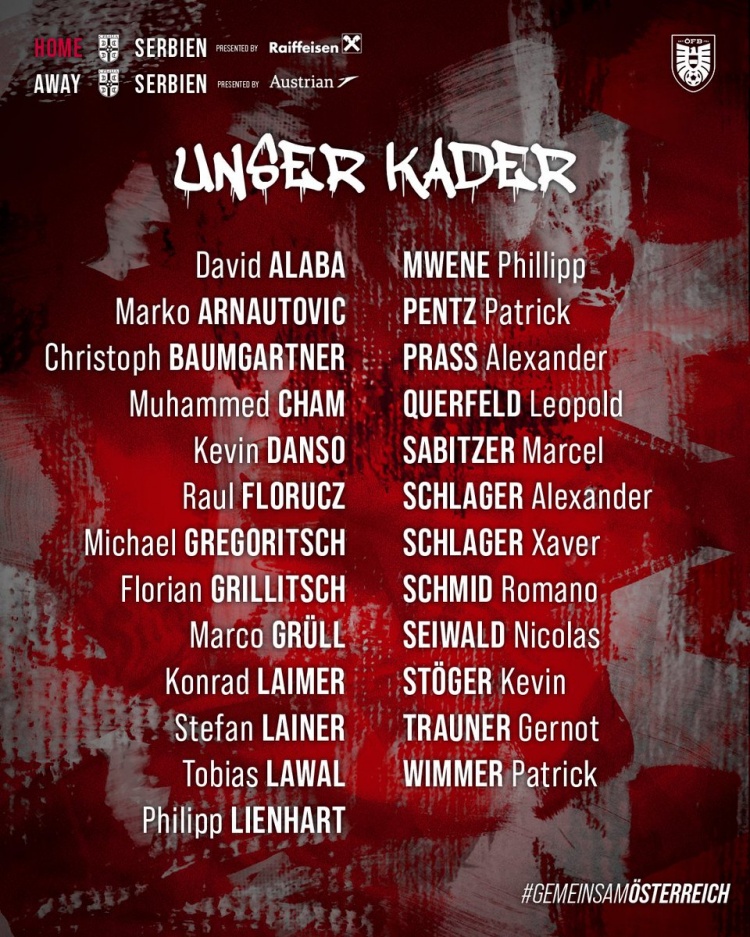 奧地利名單:阿拉巴領銜,阿瑙托維奇、薩比策、萊默爾、丹索在列