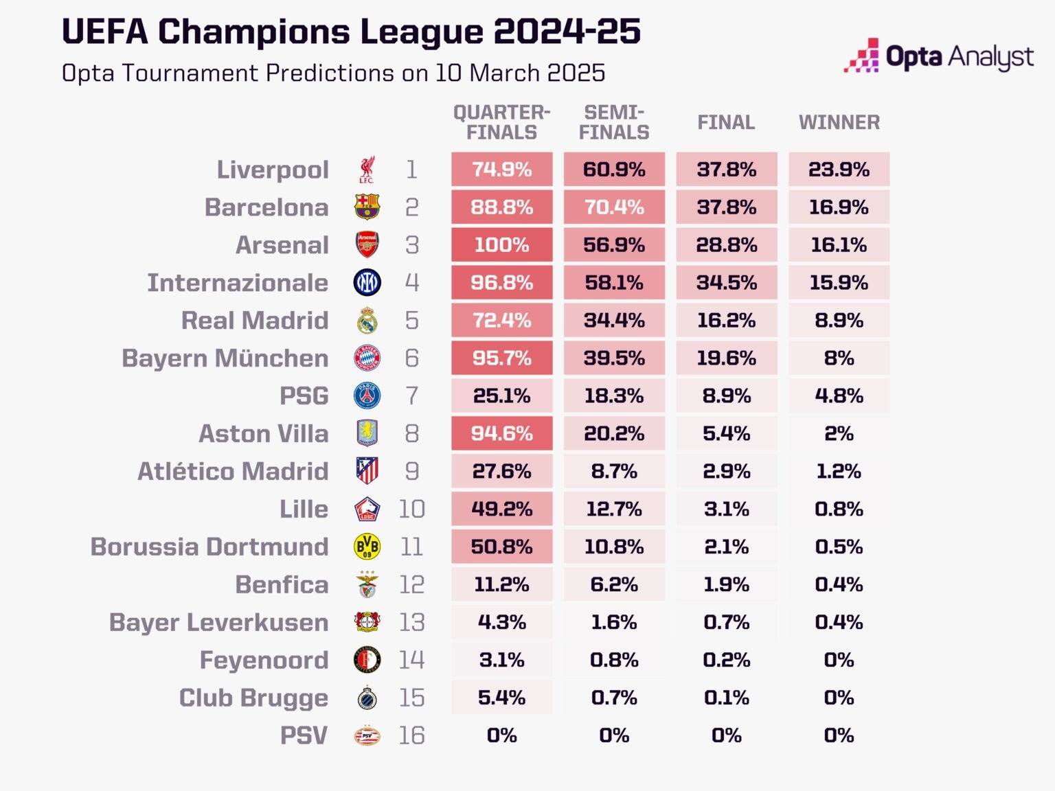 Opta預(yù)測(cè)歐冠1/8決賽次回合勝率: