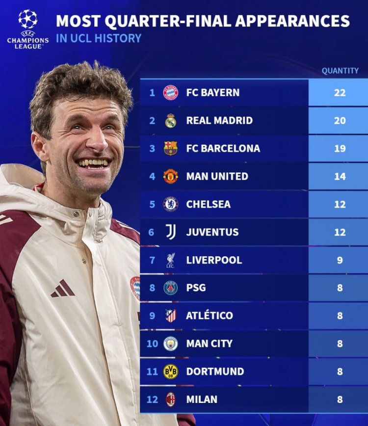 改制后歐冠共12支球隊至少8次晉級八強:
