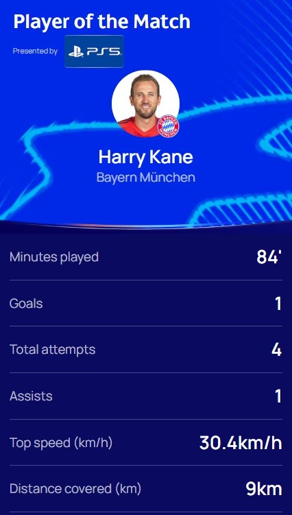 本場(chǎng)比賽凱恩發(fā)揮出色,打進(jìn)一球還有1次助攻,4次射門(mén),跑動(dòng)距離也達(dá)到9km,賽后凱恩當(dāng)選歐冠官方評(píng)選出的本場(chǎng)最佳球員。