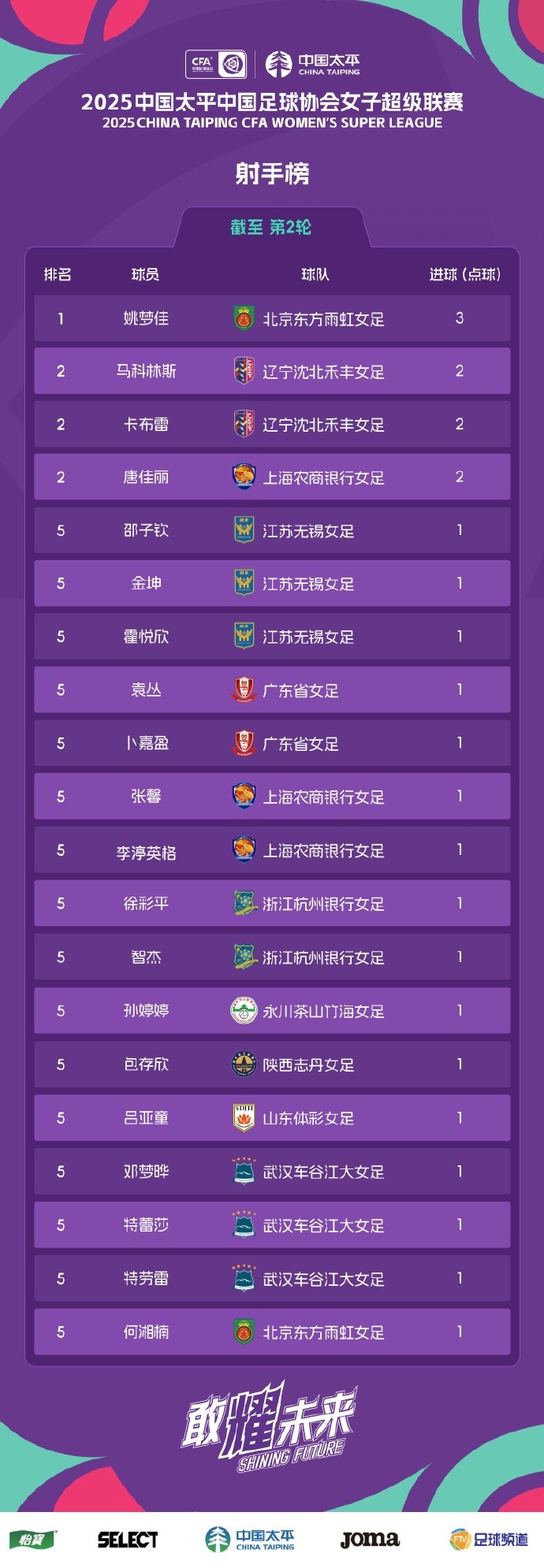 2025中國太平女超聯(lián)賽第2輪射手榜 ???