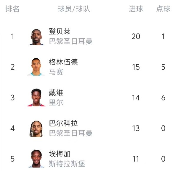 從統(tǒng)計數(shù)據(jù)上可以看到,登貝萊在法甲射手榜上已經(jīng)建立起5球的領先優(yōu)勢。更不要說他20個法甲聯(lián)賽進球里,只有1次點球破門。