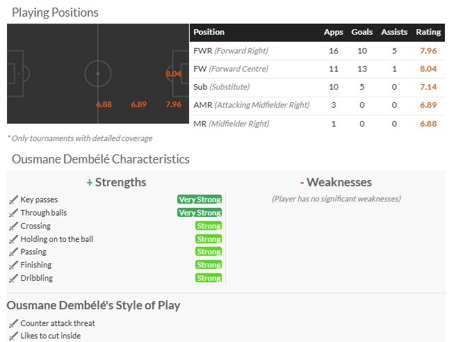 在這16場比賽里,登貝萊只有3場比賽沒進球,2度上演帽子戲法,4次梅開二度。