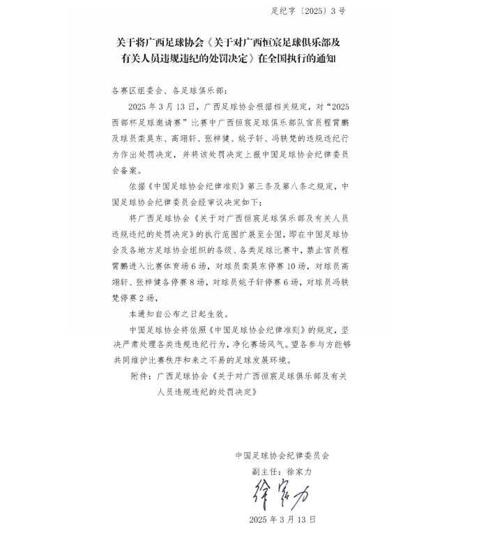 03月13日訊 中國足協(xié)發(fā)布官方公告,宣布對陜西聯(lián)合和廣西恒宸球員的停賽處罰擴大到全國執(zhí)行。