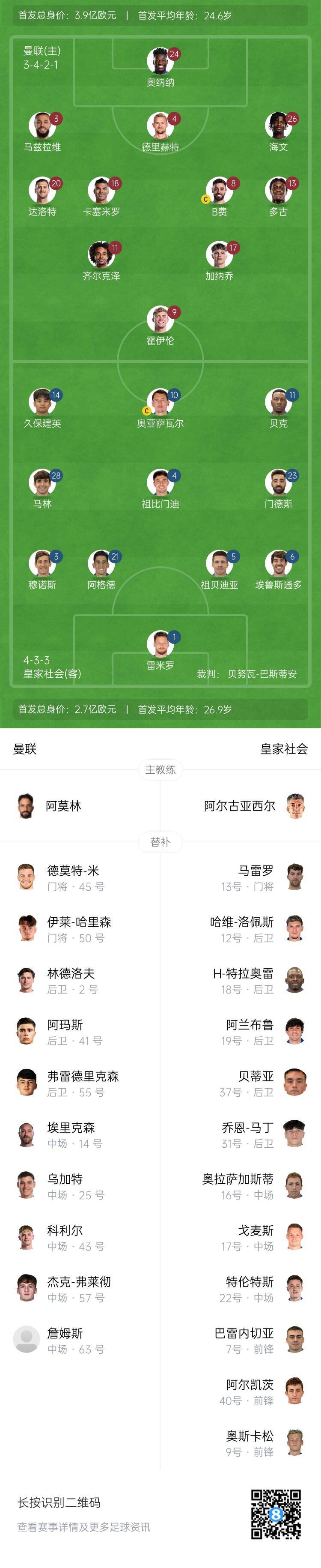 曼聯(lián)首發(fā):24-奧納納、3-馬茲拉維、4-德利赫特、26-海文、20-達(dá)洛特、18-卡塞米羅、8-B費(fèi)、13-多古、17-加納喬、11-齊爾克澤、9-霍伊倫