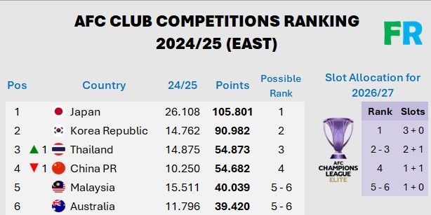 馬來超 40.039分 2026-27賽季亞冠精英聯(lián)賽名額1個