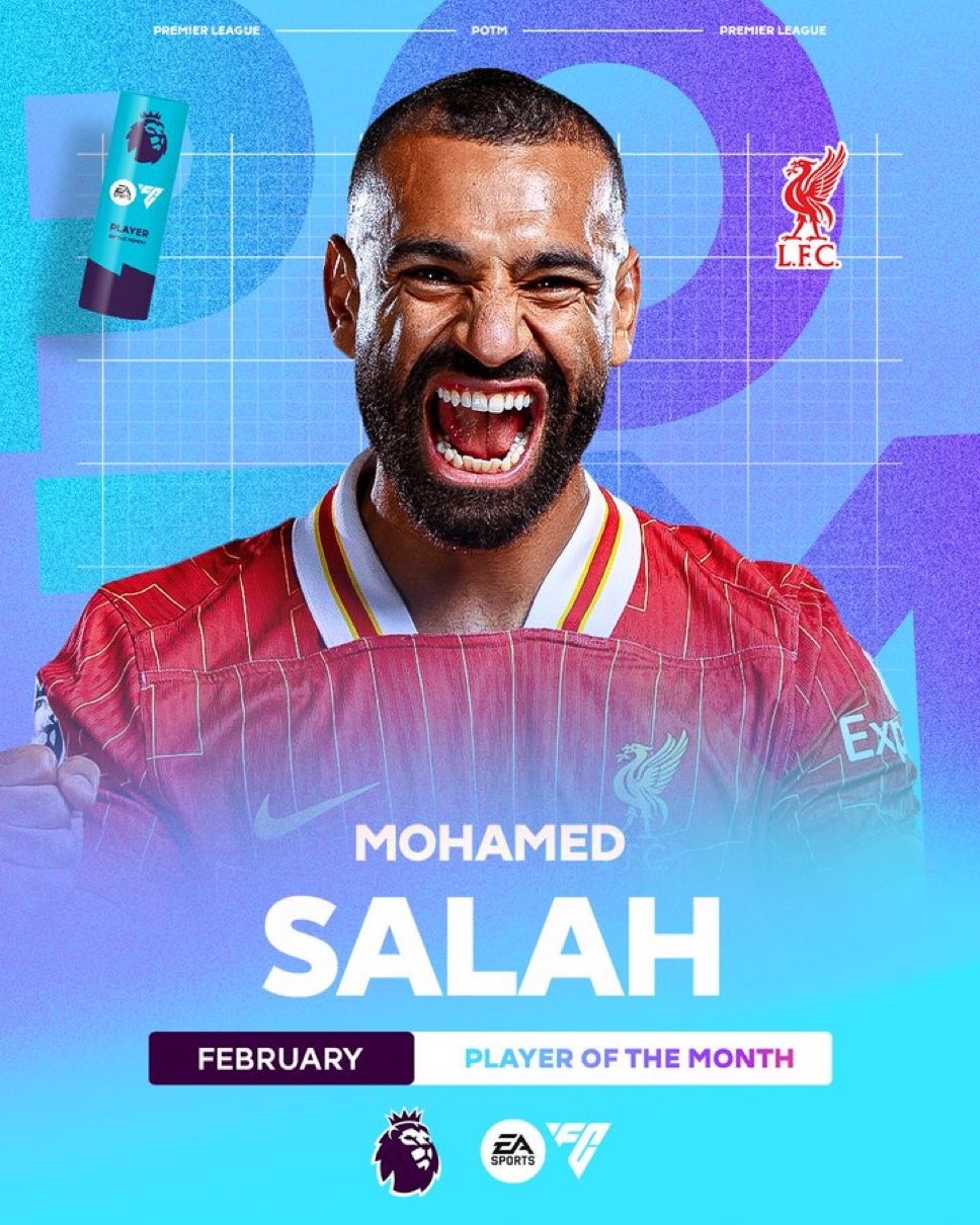 7次獲獎(jiǎng)平紀(jì)錄!官方:薩拉赫當(dāng)選英超2月最佳球員,2月6場(chǎng)6球4助