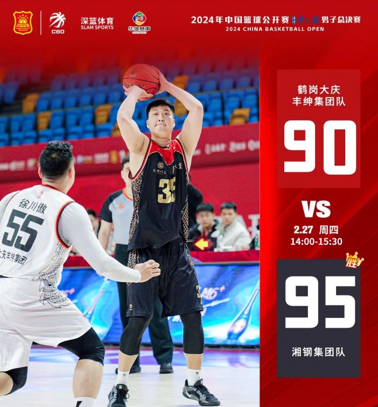 比賽開始,兩隊(duì)上來(lái)比較慢熱。隨后大慶豐紳集團(tuán)積極拼搶前后場(chǎng)籃板,牢牢把握籃下優(yōu)勢(shì),率先取得領(lǐng)先。湘鋼集團(tuán)組織快攻,同時(shí)在外線穩(wěn)定輸出,緊咬比分。半場(chǎng)結(jié)束,大慶豐紳集團(tuán)48-46領(lǐng)先湘鋼集團(tuán)。下半場(chǎng),兩隊(duì)打得依舊膠著。末節(jié)90平后,湘鋼集團(tuán)26號(hào)陳雙三分命中,2號(hào)達(dá)斯坦·哈爾恒搶斷后上籃得分,幫助湘鋼集團(tuán)95-90戰(zhàn)勝大慶豐紳集團(tuán)。