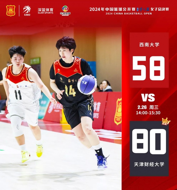 上半場首節(jié),兩隊(duì)打得相對(duì)膠著,比分緊咬。第二節(jié),西南大學(xué)手感欠佳,單節(jié)只得到9分。天津財(cái)經(jīng)大學(xué)則保持著不錯(cuò)的進(jìn)攻勢(shì)頭,單節(jié)拿到25分。半場結(jié)束,天津財(cái)經(jīng)大學(xué)37-24領(lǐng)先西南大學(xué)。下半場,西南大學(xué)7號(hào)應(yīng)茵、12號(hào)莫琇雅前后場籃板拼搶積極,但無奈前期存在一定差距,最終西南大學(xué)58-80不敵天津財(cái)經(jīng)大學(xué)。