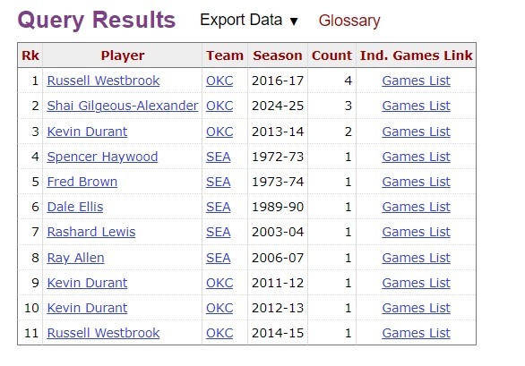 根據(jù)數(shù)據(jù)統(tǒng)計,這是亞歷山大本賽季第4次砍下50+,他追平威少,并列雷霆隊史單賽季50+場次榜榜首。