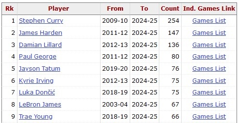 據(jù)統(tǒng)計,這是特雷-楊生涯第67次單場砍下至少30分且投進至少5記三分,他也追平詹姆斯排在歷史第8位。