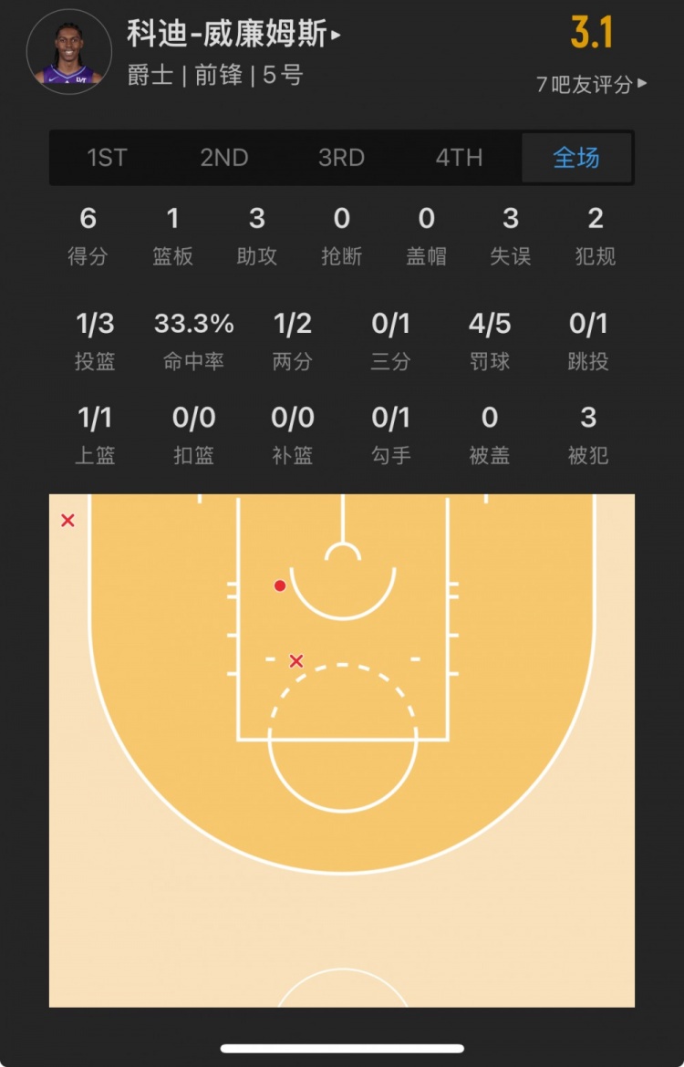 爵士10號(hào)秀 科迪-威廉姆斯 登場(chǎng)15.8分鐘