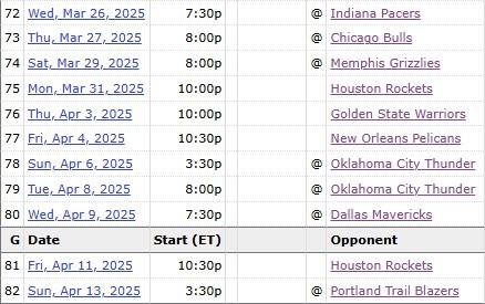 本賽季湖人還有11場常規(guī)賽,對手依次是步行者、公牛、灰熊、火箭、勇士、鵜鶘、雷霆、雷霆、獨(dú)行俠、火箭、開拓者。
