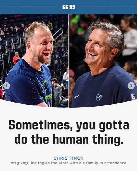 比賽的結(jié)果也許并不是那么重要,拿下聯(lián)盟墊底的球隊(duì)并不意味著森林狼就能確保打進(jìn)季后賽。但對(duì)英格爾斯來(lái)說(shuō),他是這場(chǎng)比賽絕對(duì)的主角,隊(duì)友、保安、工作人員、媒體,所有了解內(nèi)幕的人都在祝福他。正像妻子蕾娜在社交媒體上說(shuō)的,“對(duì)我們和我們的家人來(lái)說(shuō),今晚真的比籃球更重要?!?/span>