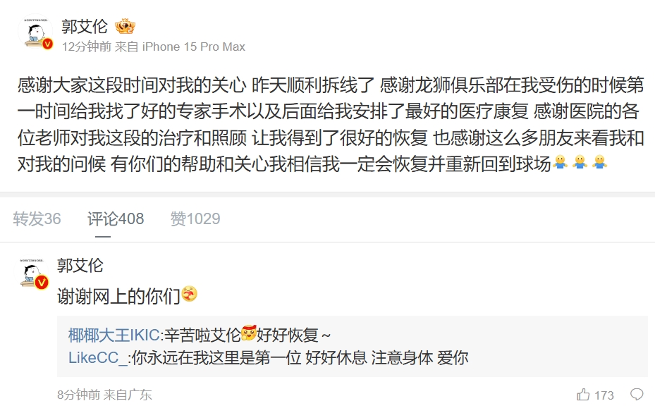 郭艾倫更博報平安:順利拆線了 我一定會恢復并回到球場!