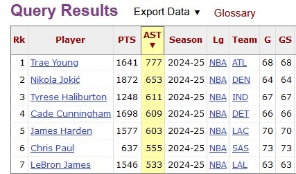 本場(chǎng)過后,特雷-楊本賽季助攻數(shù)逼近800,來到796。他也高居賽季助攻榜首位,比第2名約基奇多了143個(gè)!榜單前7名如下: