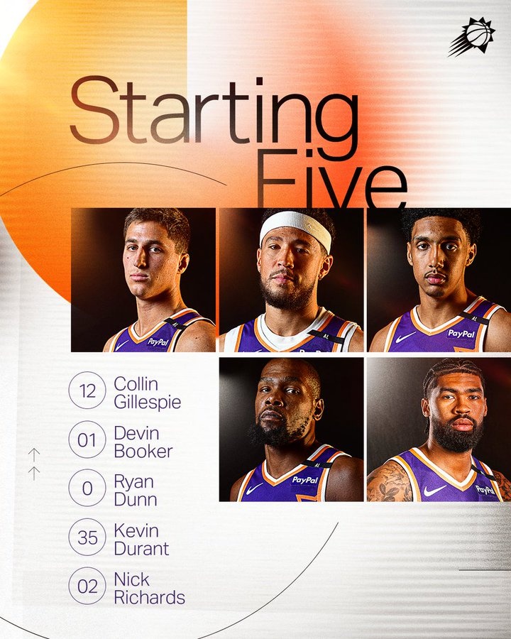 賽前太陽公布了本場首發(fā)陣容:吉萊斯皮、布克、瑞安-鄧恩、杜蘭特和理查茲。