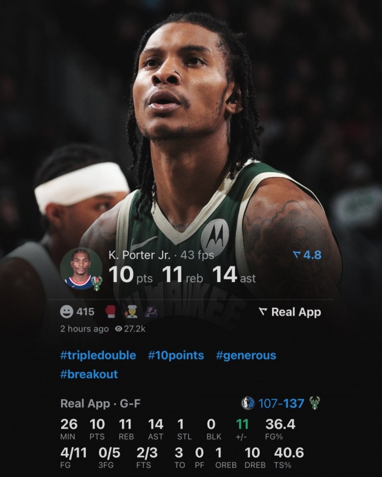 這是小凱文-波特加盟雄鹿后出戰(zhàn)的第10場比賽,他也成為隊史首位在加盟后前10場比賽中便拿下三雙的球員。
