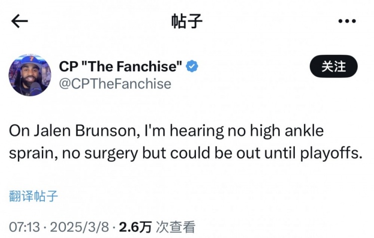 “關(guān)于杰倫-布倫森,我聽(tīng)說(shuō)不是高位腳踝扭傷,不需要手術(shù)治療,但他可能要缺席至季后賽開(kāi)始前?!痹摬┲鲗?xiě)道。