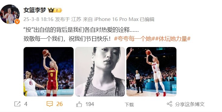 3月8日訊 今日,中國女籃球員李夢更新社媒,曬出了一組照片。