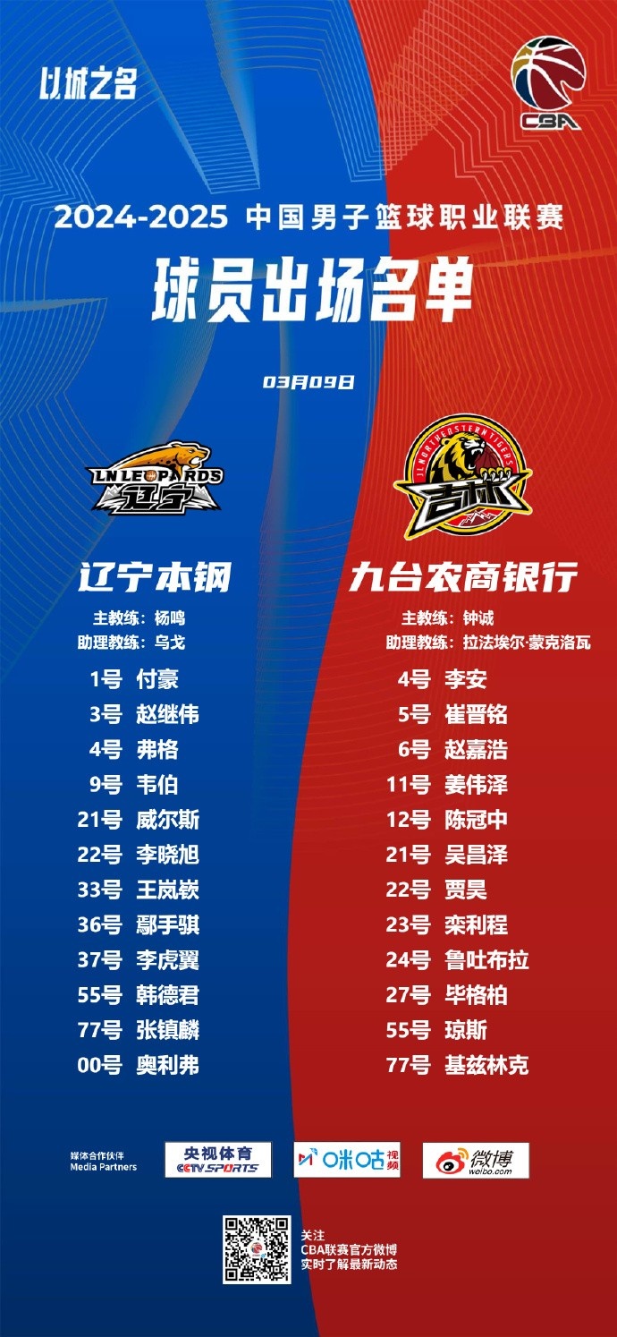 遼寧隊(duì):付豪、趙繼偉、弗格、韋伯、威爾斯、李曉旭、王嵐嵚、鄢手騏、李虎翼、韓德君、張鎮(zhèn)麟、奧利弗。
