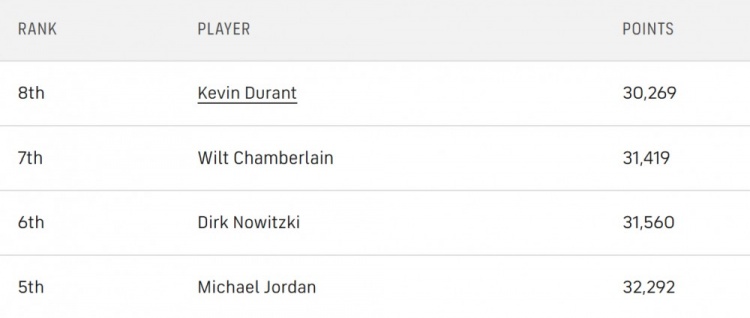 杜蘭特目前排名第8,并且總得分仍然在漲,而第7的張伯倫總得分領(lǐng)先庫(kù)里超過(guò)6000分。雖然不能說(shuō)完全不可能,但很難想象庫(kù)里能夠排在第10名之上。至于達(dá)到30000分里程碑,這更是一個(gè)極高的要求。