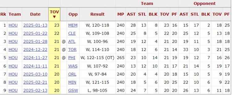本場比賽,火箭全隊送出了失誤20次。