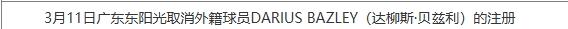 03月11日訊 CBA官網(wǎng)更新外籍球員注冊名單,廣東取消貝茲利的注冊,重新注冊吉倫沃特。