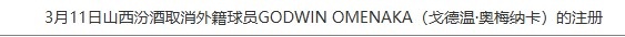 3月11日訊 今天,CBA官方更新了外籍球員注冊信息,山西男籃取消了戈德溫-奧梅納卡的注冊。