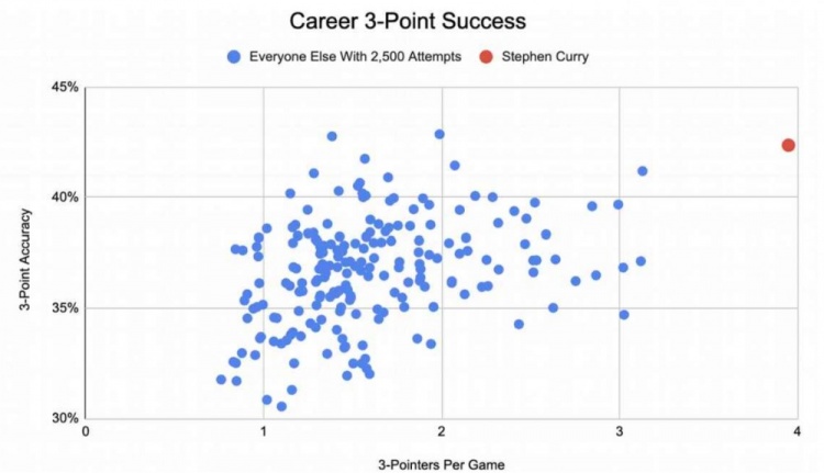 庫里的獨(dú)特之處不僅在于他投的三分球比任何人都多,還在于他能以令人難以置信的效率命中這些三分出手。在職業(yè)生涯至少出手2500記三分球的198名球員中,庫里的三分命中率排名第三(42.4%),僅次于凱爾-科沃爾和史蒂夫-納什。
