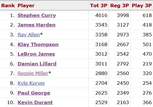 庫里常規(guī)賽和季后賽三分命中數(shù)來到4618記 距5000大關(guān)僅差382記