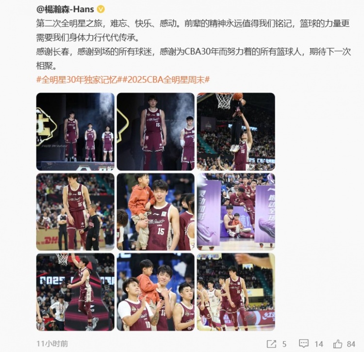 楊瀚森配文:“第二次全明星之旅,難忘、快樂(lè)、感動(dòng)。前輩的精神永遠(yuǎn)值得我們銘記,籃球的力量更需要我們身體力行代代傳承。感謝長(zhǎng)春,感謝到場(chǎng)的所有球迷,感謝為CBA30年而努力著的所有籃球人,期待下一次相聚。”