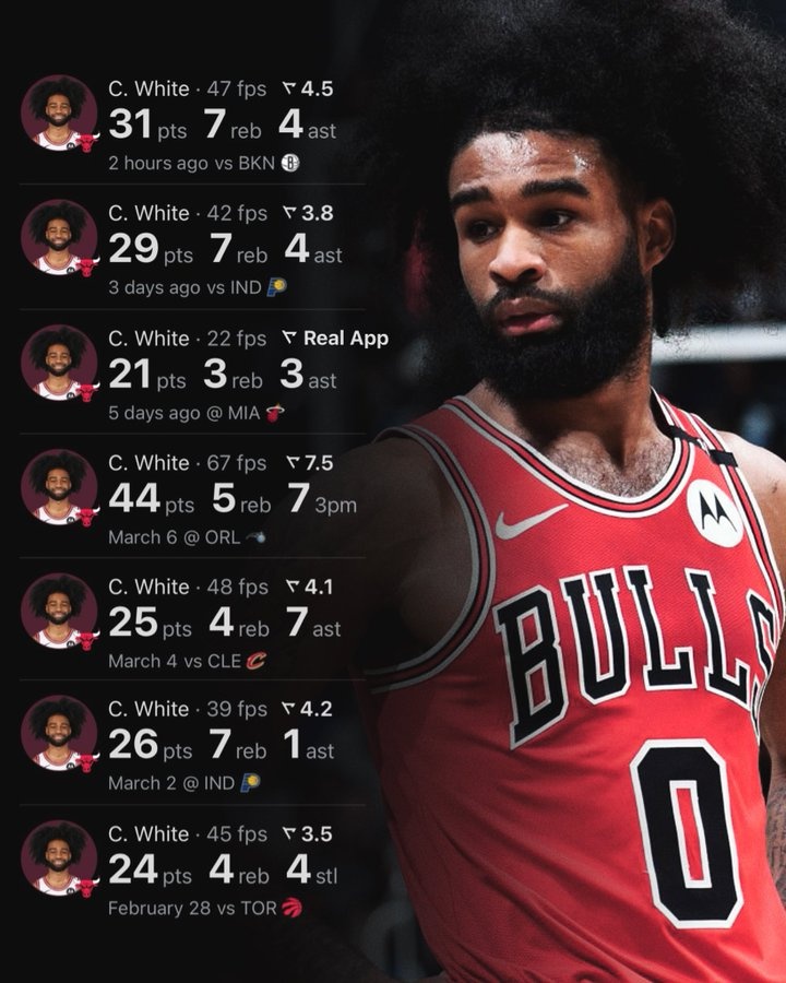 此役公牛后衛(wèi)科比-懷特火力全開,打了36分鐘24投12中,三分8中3、罰球4中4砍全場最高31分外加7籃板4助攻1搶斷,正負(fù)值+7。