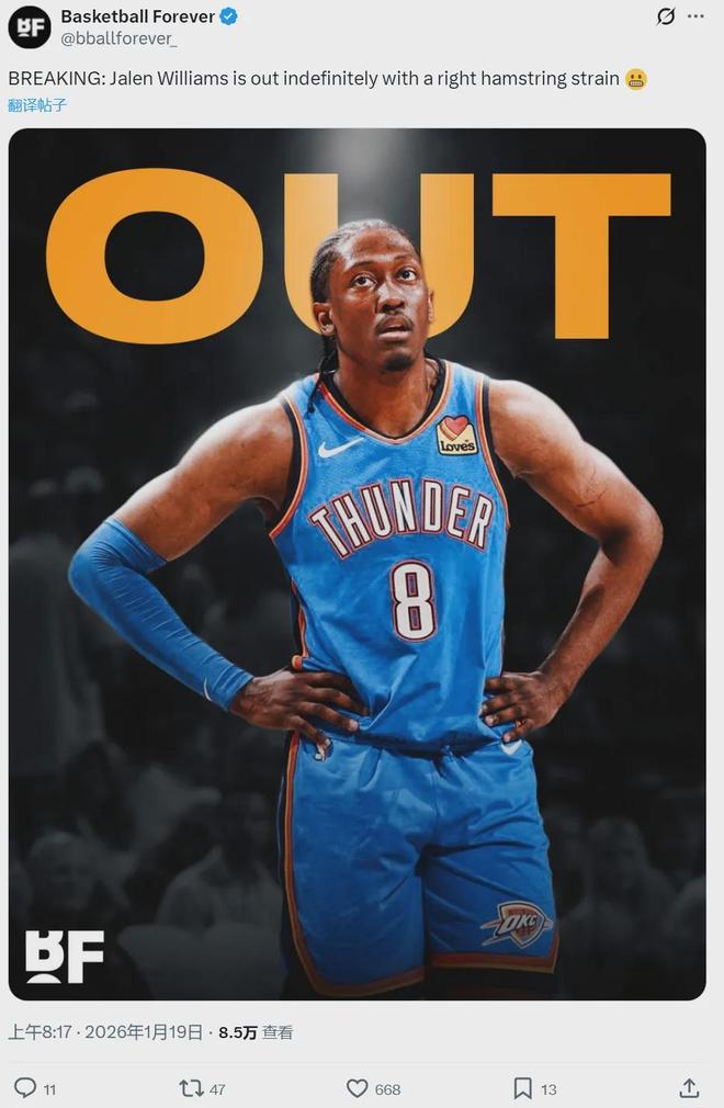 北京時間2月9日,雷霆官方宣布:亞歷山大(腹部拉傷)、阿杰伊-米切爾(腹部拉傷)索伯(右膝十字韌帶撕裂)、托皮奇(睪丸手術(shù)),將缺席明天和湖人的比賽。此外,已經(jīng)連續(xù)缺席10場比賽的杰倫-威廉姆斯,將在明天復(fù)出!