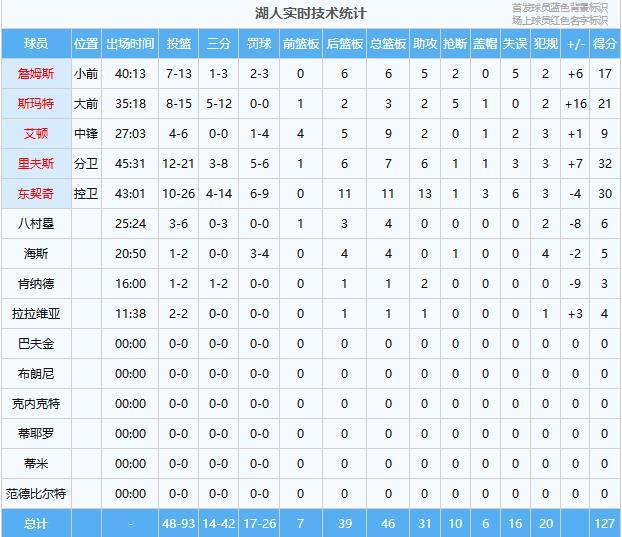 里夫斯32分7板6助、東契奇30分11板13助3帽、斯瑪特21分3板2助5斷、詹姆斯17分6板5助2斷、艾頓9分9板2助、八村塁6分4板、海斯5分4板、拉拉維亞4分1板1助