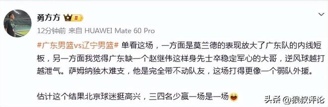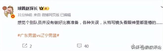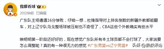 博主我耀打球發(fā)文點(diǎn)評(píng):廣東隊(duì)主場(chǎng)遭遇16分慘敗,仔細(xì)一想,杜鋒指導(dǎo)對(duì)上排名倒數(shù)的新疆外教都能翻車,對(duì)上遼寧隊(duì)烏戈整場(chǎng)球被壓制也不奇怪了,CBA這些個(gè)外教確實(shí)有些水平