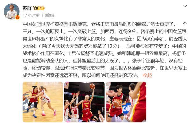 賽后,媒體人蘇群在點(diǎn)評(píng)中國(guó)女籃時(shí),直接點(diǎn)名對(duì)張子宇的看法。蘇群表示:“張子宇還很年輕,沒(méi)有經(jīng)驗(yàn),移動(dòng)較慢,跟現(xiàn)代籃球節(jié)奏比較脫節(jié),因?yàn)槭澜绫嚯x比較近,在世界大賽上成為決定性因素還遠(yuǎn)遠(yuǎn)不夠,所以如何使用還挺講究方法。”