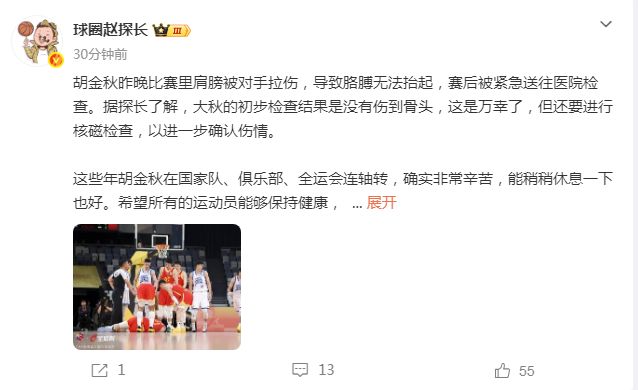 至于在廣廈戰(zhàn)勝寧波的比賽,胡金秋不慎被對手拉傷肩膀,導致他無法抬起胳膊,賽后也是被球隊緊急送往醫(yī)院檢查。根據(jù)球圈趙探長的報道:“大秋(胡金秋)的初步檢查結果是沒有傷到骨頭,這是萬幸了,但還要進行核磁檢查,以進一步確認傷情。”