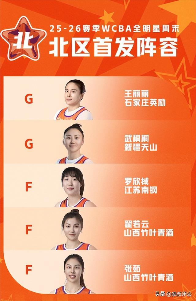 北區(qū)首發(fā)球員:王麗麗(石家莊英勵(lì))、武桐桐(新疆天山)、羅欣棫(江蘇南鋼)、翟若云(山西竹葉青酒)、張茹(山西竹葉青酒),武桐桐以134529票當(dāng)選北區(qū)票王。