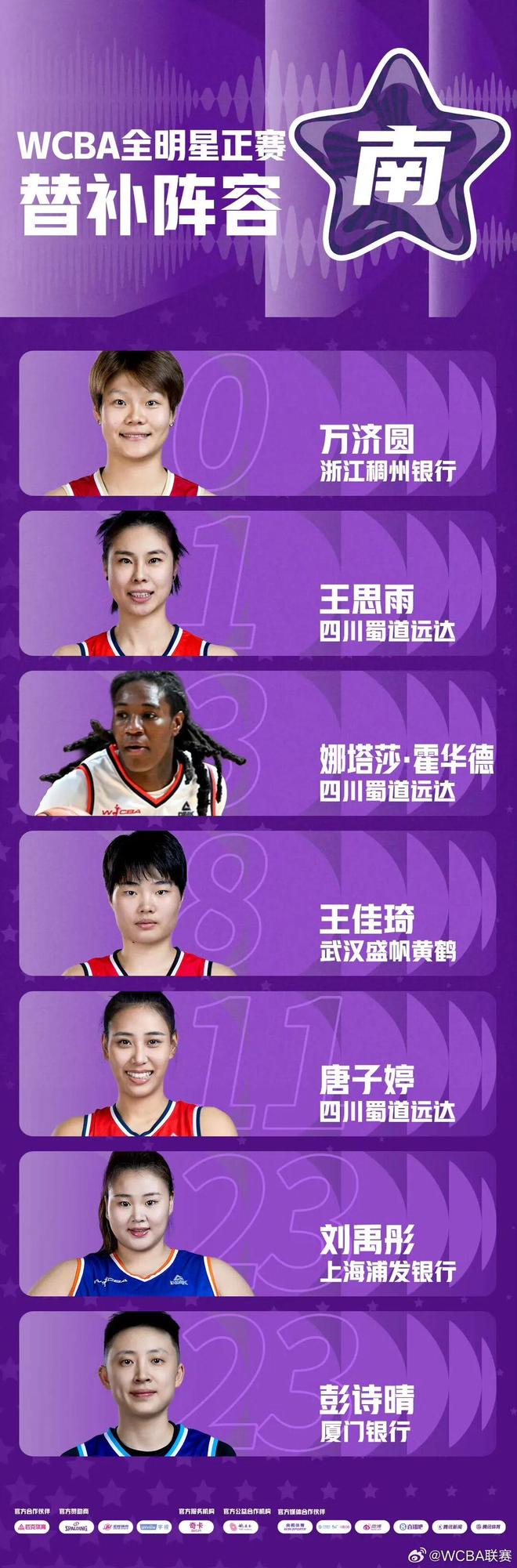 萬濟(jì)圓入選全明星正賽南區(qū)替補(bǔ)陣容;李雨汧、代夢(mèng)帆入選星銳賽南區(qū)陣容;董可爾入選三分球大賽;周琪入選技巧大賽。